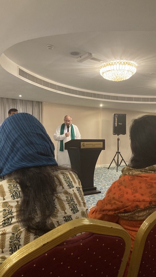 After our conference today, everyone rested in the afternoon in preparation for the evening gospel Church service event. It was an amazing experience to worship the Lord with our Pakistani brothers and sister from Sharjah and Dubai. The service began with singing and worship, followed by several testimonies. After the testimonies, we sang some more worship songs followed by prayer. Then one of the local pastors would preach. Most of the service was conducted in Urdu, the language of Pakistan. This pattern would continue for a few times until the main preacher came to give the sermon. Tonight, Pastor AJ preached on The Great Commission from Matthew 28:19-20. Through an interpreter, AJ reminded all of us that while it is our responsibility to share the gospel, it is God's job to bring a person to salvation in Him. A A great and encouraging reminder and very fitting for what our leaders have been studying throughout our conference on The End Times. Our FB team loves to experience a church service in another country and in another language. It's such a joy to worship in other languages because we get to experience a little piece of Heaven on earth! In Pakistani worship services, the women cover their heads throughout the service. This is different from our practice in the American church. Out of respect for our brothers and sisters in Christ, we chose to honor them as we worshipped together. After the service, we all had dinner together-biryani (chicken and rice with yogurt and mint), water, and a sweet treat, similar to a doughnut hole in a light syrup. It was pretty late by the time the church service ended, around 11:00 PM and we still needed to head home and prepare for our last day. And guess what we hit? TRAFFIC! That's right, tons of traffic. We are grateful for our taxi drivers navigating all of the closed roads, but we will admit that at times it was a bit dicey! None the less, we made it back to our hotel well after midnight. We were exhausted and yet full of joy and filled with God's Spirit as we anticipated tomorrow, our last day.