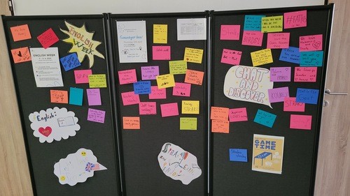 This was our fun colorful english conversation board at the school promoting our afternoon activities. Students could write notes to us and we as teachers could write notes to them.