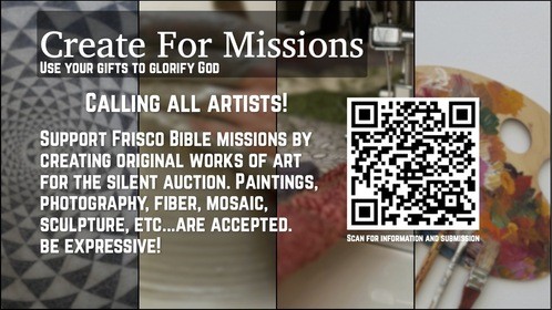 Frisco Bible artists—help support global missions by donating your original artwork to our upcoming Silent Auction. All mediums are welcome, and this year’s theme is Transformative Love. Share your gifts to glorify God, bless others, and showcase the creativity within our church family.