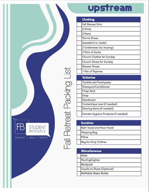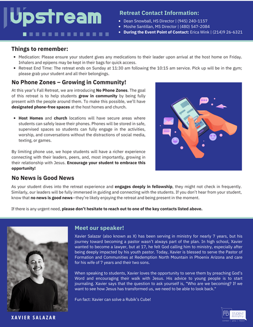 Parents, join us in going upstream and supporting this important step for your student’s spiritual growth. Let’s help them unplug, reconnect, and thrive in community at Fall Retreat.