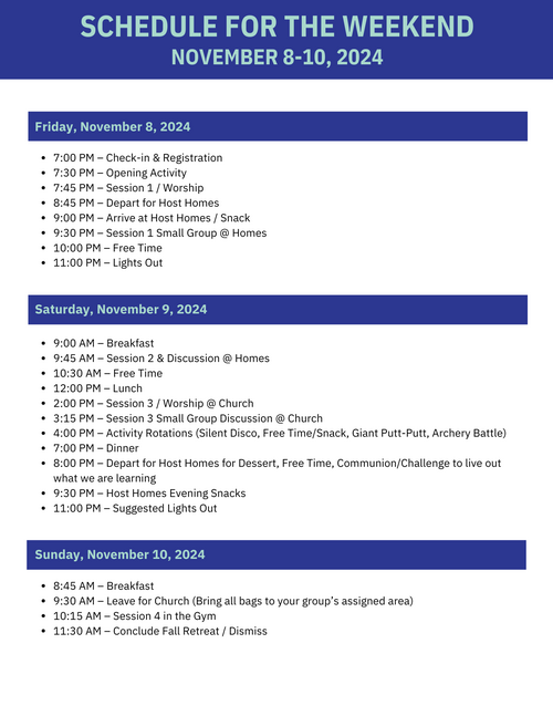 Welcome to the Fall Retreat Parent Info Hub! This site is exclusively for parents with students registered for our Fall Retreat. Here, you'll find everything you need to stay informed and up to date. We will continuously update this page as we get more information, so feel free to check back often.