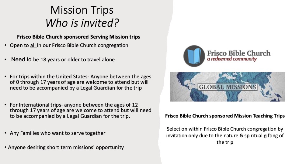 The purpose of going on a mission trip at Frisco Bible is to encourage you to step out of your regular rhythm, experience John 3:16 as you go in Jesus' name, and be transformed to live out your faith when you return home. We offer two types of mission trip opportunities: Serving Trips and Teaching Trips. Frisco Bible mission trips support long-term ministry partners, share the gospel, and meet practical needs in communities around the world. We serve in partnership, not independently. Our mission trips will connect everyday people with God's work around the world.
