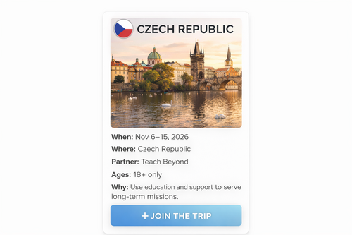 Mission trips invite us to step out of our regular rhythm and live out our faith in action. Inspired by John 3:16 and Matthew 28, we go in Jesus' name to serve and be transformed.